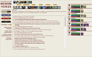HentaiVerse battles are initiated by the player entering one of the battle modes manually or via Random Encounters which happen approximately once per hour while browsing the E-Hentai site if the player is not already in combat. Each battle will spawn a number of monsters to fight. The player always acts first. The difficulty of the HentaiVerse battles may be selected out of battle.